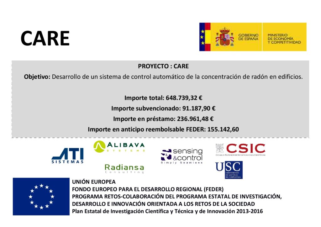 - Proyecto CARE (2017): «Desarrollo de un sistema de control automático de la concentración de Radón en edificios» a través de una convocatoria RETOS junto con el Laboratorio de Análisis de Radiaciones (LAR) de la Universidad de Santiago de Compostela, el CSIC y las empresas Alibava Systems, Radiansa y Sensing & control.