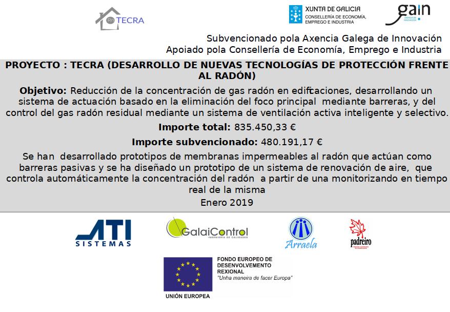 - Proyecto TECRA (2016): «Desarrollo de nuevas tecnologías de protección frente al Radón», realizado a través de una convocatoria Conecta PEME, junto con el Laboratorio de Análisis de Radiaciones (LAR) de la Universidad de Santiago de Compostela y las empresas Padreiro, Arraela y Galaicontrol.